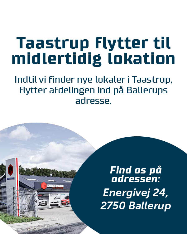 Vi beklager de gener, den midlertidige flytning måtte medføre for dig som kunde i Taastrup-afdelingen, og glæder os til at se dig i vores Ballerup-afdeling, næste gang din bil skal til service.
